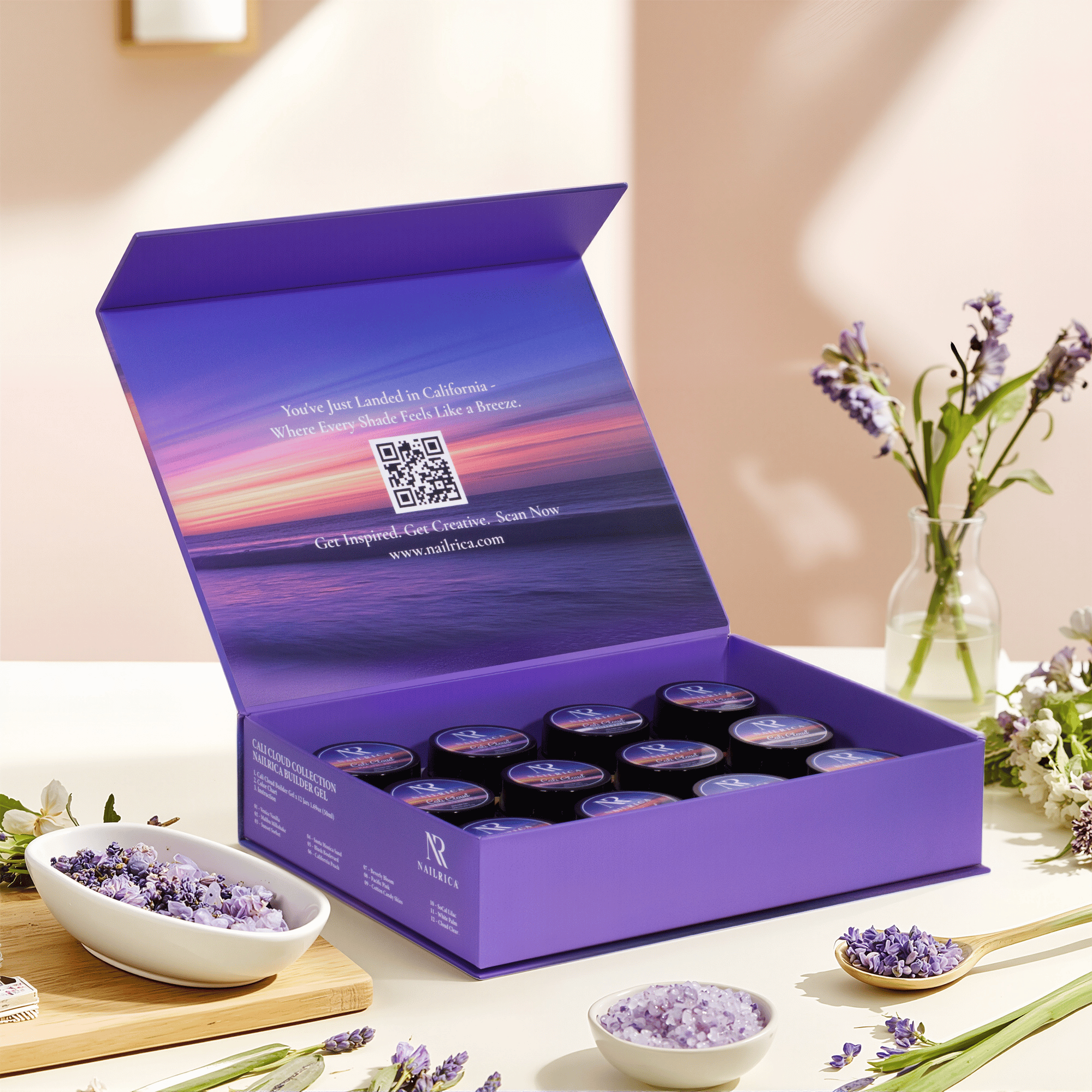 Elevate your nail game with the Cali-Cloud Builder Gel Collection from NAILRICA – a premium set of 12 highly pigmented builder gels in a jar, inspired by the soft, dreamy skies of California.