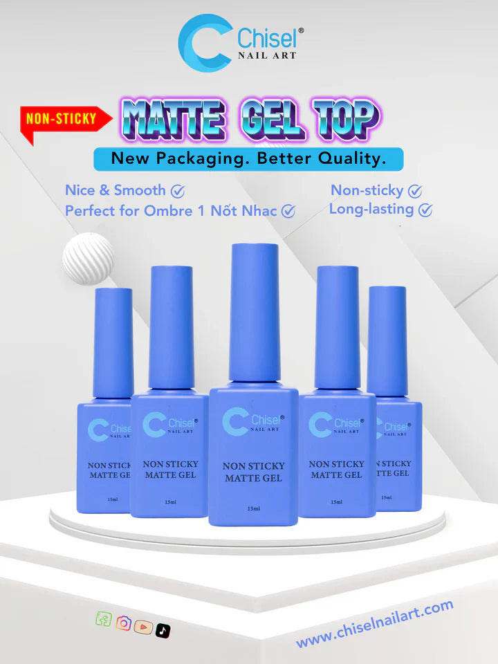 Take your nail art to the next level with Chisel’s Non-Sticky Matte Gel Top! This premium gel top coat delivers a nice and smooth application, leaving a flawless, velvety matte finish that’s both chic and durable.